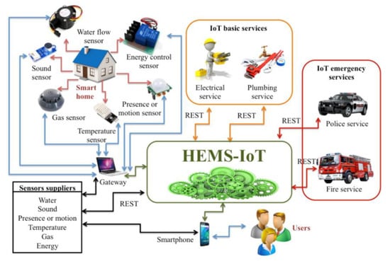 As seen in Figure 2, sensors are a key element in smart home monitoring. By collecting real-time information, sensors allow HEMS-IoT to analyze and identify how much power smart home appliances and devices are consuming. Users can visualize and monitor this information on a daily basis to make the necessary energy-saving adjustments. Also, thanks to sensors, HEMS-IoT can issue appropriate energy-saving recommendations and invoke both basic services (e.g., plumbing and electrical repairs) and emergency services (e.g., police, firefighters) when required.