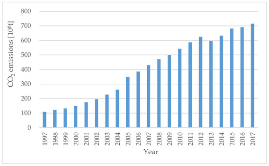 The “top-down” calculation method is used to calculate the total carbon emissions of Chinese transportation industry from 1997 to 2017 by using Equation (1), as shown in Figure 1.