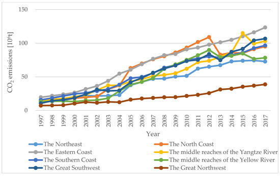 CO2 emissions in the transportation industry in the eight regions of China from 1997 to 2017.