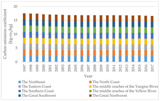 Carbon emissions coefficients of different regions in China from 1997 to 2017.