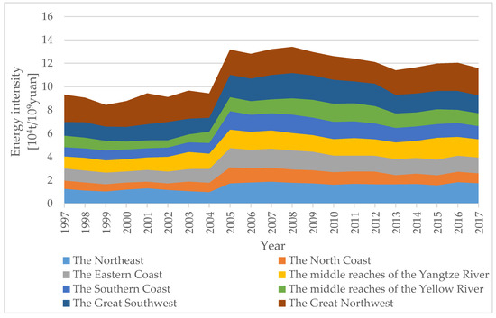 Regional energy intensities in China from 1997 to 2017.