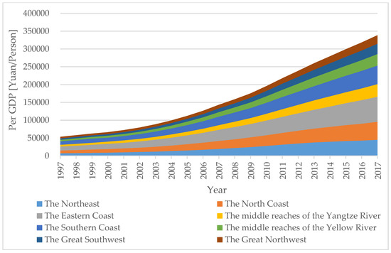Economic output is all expressed by GDP per capita in this paper. From 1997 to 2017, Chinese economic output continued to grow at an average annual rate of 10.01%. GDP per capita in 2017 was 42,407.71 yuan, 5.73 times higher than that in 1997. As shown in Figure 6, the economic output of each region continued to rise during the study range. Among them, the GDP per capita of the Eastern Coast has always been higher than that of other regions, with an average annual growth rate of 9.60%, reaching 70,347.40 yuan by 2017. Due to the superior geographical location, the Eastern Coast is the earliest to implement the reform and opening up in China and supported by national policies, so its economic output keeps rising. The economic output of the Southern Coast ranking second in 2017 was mainly because that the Southern Coast has had a strong business atmosphere and is also an area that firstly implemented the reform and open policy. With the locative advantage of being adjacent to Hong Kong, Macao and Taiwan and with the help of the good shipping conditions, it attracted the inflow of large amounts of foreign capital, making the change in industrial structure, proportional increase in manufacturing industry and rapid development of foreign trade, so it reached a relatively higher economic development level. The economic output in the Great Northwest in 2017 was the lowest in all the regions. The reason is that the Great Northwest has poor natural conditions, with wide distribution of desert, Gobi, plateaus and mountains. It makes relatively high proportions of farming and animal husbandry, with relatively low proportions of commerce and industry. In addition, the development pattern of the priority given to the marine trade since modern times also causes the decline of inland commercial. Moreover, the factor of social instability in the Great Northwest also has a certain influence on the development of its economy.