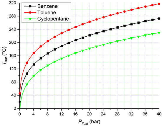 Figure 1: toluene shows the higher saturation temperature regardless of the pressure considered, while cyclopentane shows the lowest.