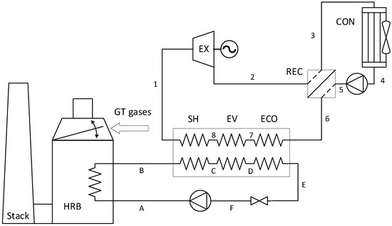 The cycle has only one pressure level and, in order to increase the system efficiency, a recuperative heat exchanger (REC) has been introduced. The hot exhaust gas mass flow (first cycle) heats the diathermic oil (second cycle, points A to F) in the heat recovery boiler (HRB), the hot oil passes then through the heat recovery steam generator (points B-E), composed by economizer (ECO), evaporator (EV) and superheater (SH). A third separated cycle is the organic fluid loop (points 1–8). After leaving the HRSG, the superheated fluid enters the turbo-expander (EX). The exhaust organic fluid exchanges then heats in the recuperator (REC), where the condensed fluid is heated. Finally, the organic fluid is cooled in a condenser (CON) and pressurised in the extraction pump. The condenser is of an air-cooled type, as the application in water-scarce areas has been considered.