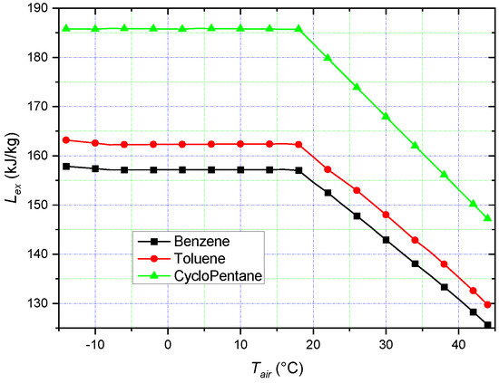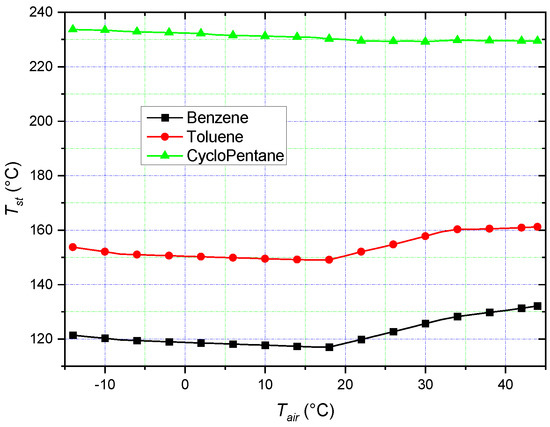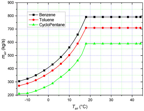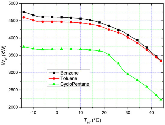 Figure 4), indicating the best performances for benzene and toluene independently from the ambient air temperature considered. The power output of the bottoming cycle decreases when air temperature increases, with a more significant power drop for higher temperatures. The curve is visibly steeper also for ambient temperatures lower than