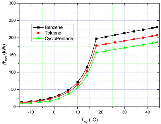 Figure 5) is not negligible; indeed, when ambient temperature increases, the control system, to maintain the pressure at the condenser constant, increases the air mass flow and, as a consequence, the pressure losses and power demand of the fan increase sharply (this can be clearly seen in