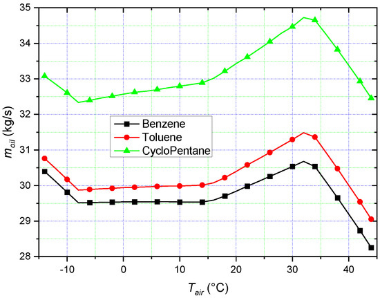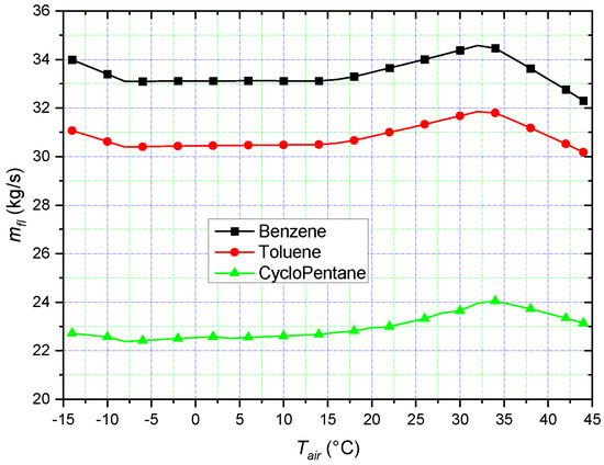 Figure 9 shows the organic fluid mass flow rate as a function of ambient air temperature. The curves show a trend similar to those of the oil mass flow rates seen in