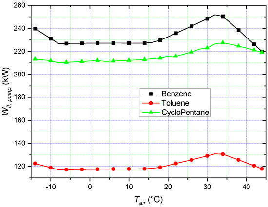 Figure 5), nonetheless a slight increase can still be appreciated, which is to be ascribed to the increase in the organic fluid pressure at the condenser. In the case of high ambient temperatures, an increase in the pressure at the condenser implies a higher saturation temperature for the organic fluid considered (