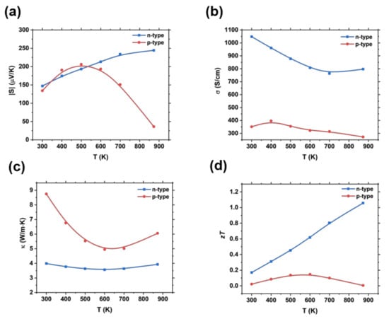 Temperature-dependent (a) Seebeck coefficient, (b) electrical conductivity, (c) thermal conductivity, and (d) dimensionless figure of merit of n-type (CoSb2.85Te0.15) and p-type (CoSb3) skutterudite used for the fabrication of the tubular thermoelectric generator (TEG) module.