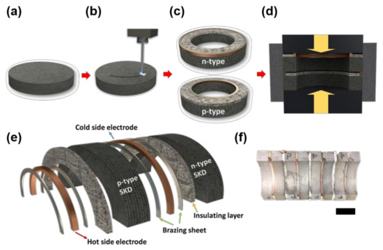 The fabrication process of the tubular thermoelectric generator is schematically shown in Figure 2. The process starts with slicing the sintered pellet into an appropriate thickness, which determines the heat-absorbing area of each TE element. The center of the pellet is cut out by wire electric discharge machining (WEDM). After that, cold side electrodes are positioned at the periphery of the outer radius of SKD. Brazing sheets are placed on top of the electrode and the rest of the area is covered by an insulating layer. The process is similar in the case of the hot side electrode, except for the electrode diameter. The hierarchical structure of the assembly is described in detail in Figure 2e. The hot side electrode, with direct contact to the heat source, has a smaller diameter than a cold side electrode. Two brazing sheets are placed at both sides of the electrode to mechanically join two different types of TE material to the electrode. Insulating layers are inserted between each TE material to electrically separate them. The mechanical and electrical joining of the electrode is done by modified resistance welding (MRW) using spark plasma sintering (SPS) equipment, as shown in Figure 2d. The digital photograph of the fabricated tubular thermoelectric generator with four pairs of SKD is shown in Figure 2f.