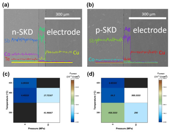 A low-magnification SEM image with an EDS line scan profile of the bonded interface between the TE material and the electrode is shown in Figure 3a,b. From the SEM, the interface is perfectly joined and devoid of cracks with no interdiffusion between the components. To find out the optimum joining condition, we measured the specific contact resistance at different temperatures and pressures (Figure S1). A summary of the specific contact resistance (ρcontact) for various joining conditions is shown for n-type in Figure 3c and p-type in Figure 3d. Generally, specific contact resistance decreases as temperature rises, but this is not the case for the pressure. No bonding is formed at 425 °C, 10 MPa condition in both n- and p-type SKD, including 350 °C, 5 MPa for n-type SKD. The optimum sintering conditions were observed at a temperature of 425 °C, and a pressure of 5 MPa, resulting in an n-type specific contact resistance of μΩ·cm2 and p-type specific contact resistance of 6.853 μΩ·cm2. This specific contact resistance is only 1/100 of the previously reported value between the SKD–Cu interface [33], but also comparable to the value between the SKD–MoCu interface [34]. More detailed comparison is given in supplementary material (Table S1).