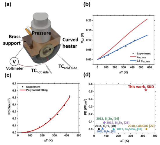 Output characteristic of the tubular thermoelectric generator. (a) Schematic of the experimental setup for measuring the output power of the module. (b) Measured open circuit voltage (VOC) of the module for various temperature differences. Ideal VOC, calculated from the material’s property, is drawn together. (c) Output power and (d) power density of the module. Recently reported power density of tubular TEGs at their operating temperature difference is plotted for the comparison [20,22,23,24,28,37].