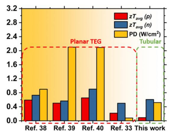 Comparison of zTavg and power density of recently reported skutterudite-based conventional planar TEGs and our module. Despite the poor performance of p-type TE material, the power density of our module is higher than that of the planar TEGs, showing the advantage of the MRW process for the fabrication of tubular TEGs.