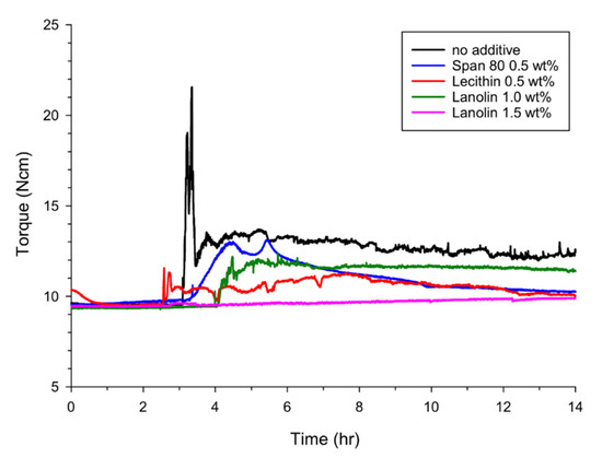 Although AAs are normally used when the fluid in a system has a low water content, the rotational torque depending on the time at 50% water cut (with and without AAs) was also measured to verify the anti-agglomeration effect of the AAs under conditions favoring rapid hydrate formation (Figure 3). As expected, hydrate formation progressed faster with increased water content, which led to rapid changes of the rotational torque with and without the AAs. The starting points of the rotational torque changes were found to be at about 2.0 h, which was faster than 3.0 h at a 30% water cut. Under four experimental conditions, no additive, 0.5 wt% Span 80, 0.5 wt% lecithin and 1.0 wt% lanolin added to the system, the maximum torque was 27.4, 28.0, 30.0 and 23.9 N·cm, respectively. This indicated that no significant anti-agglomeration effect was obtained from the addition of the AAs. However, the terminal values of rotational torque after 16 h were found to be 19.5, 19.5 and 17.0 N·cm from adding Span 80, lecithin and lanolin, respectively, which showed some improvement from 23.7 N·cm with no additive. In addition, when the concentration of lanolin added was increased to 1.5 wt%, the maximum and terminal torque values obtained were 24.0 and 13.9 N·cm. The water conversions into the hydrate formed at the end of the experiments were found to be 28.2–29.4% regardless of the AA materials. In this case (50% water cut), higher water conversions were observed because the amount of water was increased while the amount of gas (experimental pressure) remained constant. All of these results meant that the flow characteristics of the fluid were enhanced in spite of the rapid hydrate formation.