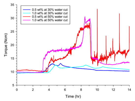 Next, the same kinetic experiments at 30% and 50% water cuts were also measured to identify the anti-agglomeration effects of the AAs depending on the concentrations added. Figure 4 shows the mechanical torque changes at the two water cuts for Span 80 while hydrate formation progressed in the fluid. When the concentration of Span 80 added was doubled from 0.5 wt% to 1.0 wt%, the terminal torque at 30% water cut and the maximum torques at both water cuts changed little for the same water cut. However, the terminal torque at 50% water cut was found to decrease when the concentration of Span 80 added was doubled. From the experiments, we suggest that the greater effect for anti-agglomeration of formed hydrates was not expected, even when the added concentration of Span 80 was increased under our experimental conditions. In addition, Span 80 also showed its anti-agglomeration effect at a lower concentration in the 30% water cut, which is why AAs are generally applied to industrial fields with lower water content. At 50% water cut or higher, hydrate-formation rates dominated the anti-agglomeration effects by an AA so that the flow assurance could not be secured by using an AA. In particular, drastic increases or surges (higher than the initial maximum torque value) of the rotational torques were observed repeatedly for Span 80 at 50% water cut, as illustrated in Figure 3 and Figure 4. Such surges were thought to be attributable to the repeated behaviors of the formation/agglomeration of hydrate particles near the stirring axis and then the breaking of the agglomerated state. In this regard, Span 80 is thought to present the potential hazard of crystal agglomeration, leading to complete blockages in oil and gas pipelines when it is applied to situations with higher water cuts.