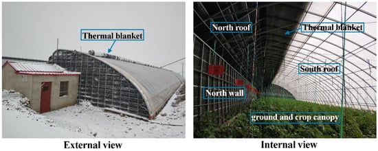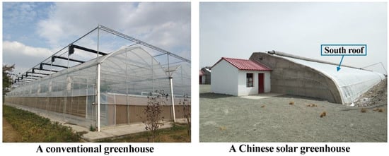 The emergence and development of greenhouses have overturned the cultivation patterns of traditional agriculture, allowing plant growth to occur beyond the limitations of the natural environment by creating a growing microclimate isolated from the external conditions [1]. This all-season production with high efficiency makes it possible to secure the food supply for the ever-increasing population and ensure the sustainable development of human society [2]. However, the high cultivation output of greenhouse agriculture requires significant energy consumption and high capital [3]. For heating purpose, large amounts of fossil fuel, natural gas, liquefied petroleum gas, and various expensive heating devices are required in greenhouses, especially during cold seasons; fossil fuel accounts for more than 50% of the total energy consumption, which, in principle, is disadvantageous for sustainable development [4,5]. Thus, greenhouse agriculture requires a choice between efficient and costly production. In recent years, the worldwide application of Chinese solar greenhouses has offered an unprecedented opportunity to break the impasse [6,7]. Unlike conventional greenhouses, Chinese solar greenhouses provide a suitable environment for various crops throughout the year without the requirement of auxiliary lighting and heating, even in areas at latitudes near 40° and when the outside air temperature falls below −10 °C [8].