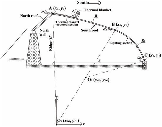 For the accurate and convenient description of the curve equation of the south roof, the solar greenhouse’s cross-section was expressed in the rectangular coordinate system with the origin at the circle center of the arc (Figure 2). Then, the coordinates of the circle center O1 (xO1, yO1) of the circle on which the arc was located, the circle center O2 (xO2, yO2) of the circle on which the arc was located, and the other key joints A (xA, yA), B (xB, yB), and C (xC, yC) on the south roof can be given as follows: