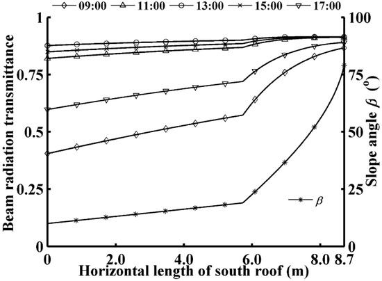 Variations of slope angle β and beam radiation transmittance along the south roof.