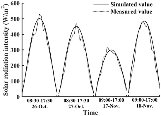 Based on the design parameters of the experimental greenhouse and the weather data of the selected days, the solar greenhouse light environment model was implemented within the MATLAB environment. In the simulation period, the lowest daily average temperature on 26 and 27 October was above zero. Therefore, the thermal blanket was kept rolled-up, and the horizontal length of the thermal blanket-covered section was kept at 0.8 m during these days. The lowest daily average temperature on 17 and 18 November was −9.8 °C, and the opening and closing times of thermal blanket in these days were obtained using a mathematic model established by Chen et al. [25], with the lighting times from 09:30 to 17:00; the moving end finally stopped at a point with the horizontal length of 0.8 m. Using Equation (24), (27), and (29), the time-dependent beam radiation, diffuse radiation, and reflective radiation at the measured point (the center of the greenhouse at a height of 1.3 m) were calculated, respectively. The summation of these three solar radiations (Equation (30)) was taken as the simulated results of the solar radiation intensity at the measurement point.
