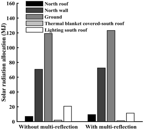 In previous studies, the multi-reflective radiation has not been considered, and the solar energy availability of the greenhouse has been underrated. In our study, a computer program was developed in MATLAB to compute the multi-reflective radiation in the solar greenhouse and evaluate the solar greenhouse light environment as accurately as possible. The reflection process occurring in the greenhouse system was reconstructed over multiple iterations by using the radiation angular distribution coefficient of several surfaces. Taking the north wall as an example, the instantaneous total reflective radiation reaching the wall’s inner surface, REw at the i-th iteration can be given as: