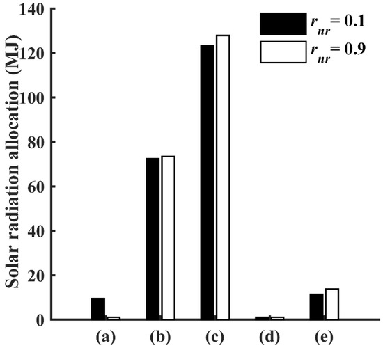 where w, nr, g, c, and tb denote the north wall, north roof, ground, canopy, and thermal blanket-covered south roof, respectively. In the following sections, when considering the solar radiation allocation, the ground and crop canopy are analyzed as a whole because, in general, they have the same solar radiation absorbance with a value of 0.9 [33,41].