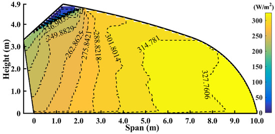 Moreover, considering the crop planting, the total solar radiation received at the canopy surface and the solar radiation distribution are the main factors affecting the plant’s photosynthesis and transpiration [36,37]. Because the canopy height varies throughout the course of the crop growth and development, the solar radiation received at the canopy surface is affected not only by the solar radiation entered through the south roof, but also the canopy surface’s location within the greenhouse. Therefore, the precise spatial distribution of the solar radiation in a solar greenhouse can be applied to provide a desirable light environment for a specific crop during the different growth stage, guiding the optimization of the solar greenhouse planting.