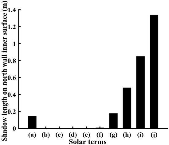 From experiences with many Chinese solar greenhouses designs, it is suggested that, when the lowest monthly average outside temperature is less than 0 °C, the north wall should receive as much solar beam radiation as possible between 10:00 and 14:00 each day, to ensure sufficient heat storage [38]. From Figure 2, it is found that the shadow falling on the greenhouse’s internal surface is mainly caused by the north roof and the thermal blanket-covered section of the south roof. In a practical application, the length of the opaque north roof is fixed, while the length of the thermal blanket-covered roof is changed: the blanket can be opened and closed. The opening and closing time depend upon both the external temperature and solar radiation conditions [25]. During the lighting hours, given that the rolled-up thermal blanket occupies a certain area, 0.8 m horizontally on the top of the south roof are set aside in accordance with the common solar greenhouse design standard [38]. Therefore, the shadow region, which changes with time, can be determined by tracing the impact point of the sunray going through the moving point at the end of the thermal blanket. Then, the dynamic light region on the north wall that can directly receive the beam radiation can be obtained.