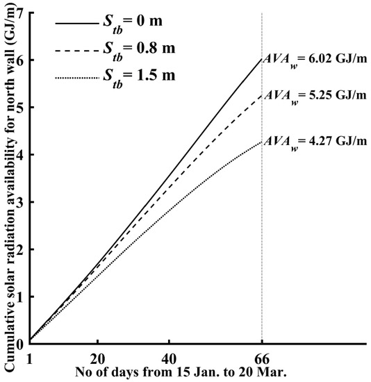 To assess the solar radiation availability in a solar greenhouse, especially at the north wall, which plays an important role in increasing the inside air temperature, two evaluation parameters are proposed for a one-meter length along the east-west orientation: the solar radiation availability for the north wall AVAw (MJ/m) and the total solar radiation availability of the solar greenhouse AVA (MJ/m):