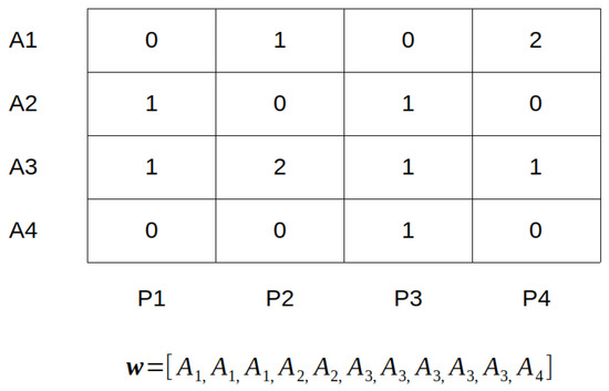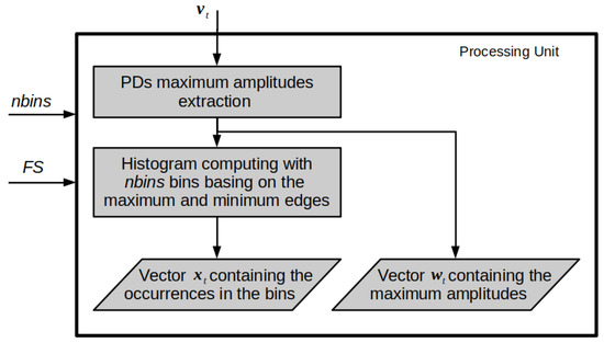 The Processing Unit (Figure 2) receives as input and works out a pair of vectors: w and x. Vector w is computed by the same algorithm that characterizes a PD pattern, but phase information is discarded in this case. Toward that end, first a PD pattern is extracted from ; it is represented as a matrix, whose columns correspond to the power supply phases, and rows mark the maximum amplitudes of the discharges. Thus, each element in the matrix identifies an amplitude-phase pair; the contents of that cell give the occurrences of discharges at that amplitude-phase pair in the time window . The resolution of the analog-to-digital converter (ADCs) actually determines the quantization levels in both the amplitude range and the phase range. Figure 3 illustrates this mechanism in a toy example, where a 2-bit ADC is employed. As a result, the PD pattern has four levels of amplitudes (, , , ) and as many levels of phases (, , , ). In the example, only one discharge with a maximum amplitude occurred at phase , whereas two discharges with the same amplitude occurred at phase phase. Figure 3 gives the associate vector w, which includes three elements with value , since phase information is discarded. Likewise, vector w includes two elements with value , five elements with value , and one element with value . The resulting size of w, in general, will depend on the non-zero occurrences of the PD pattern. The choice of not using phase information is related to the fact that such information is useful when the goal is to recognize the category of defect that generated the PD. However, the proposed strategy only focuses on the detection of aging phenomena.