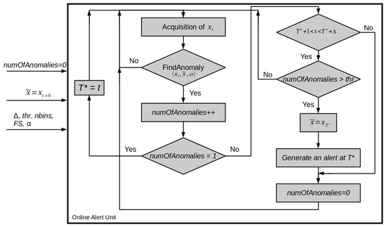 Figure 4 outlines the anomaly detection monitoring system; the flowchart illustrates the configuration for the Chi2 test. First, the reference vector is set to and the number of anomalies is initialized to 0. The parameters , , , and characterize the Online Alert Unit.