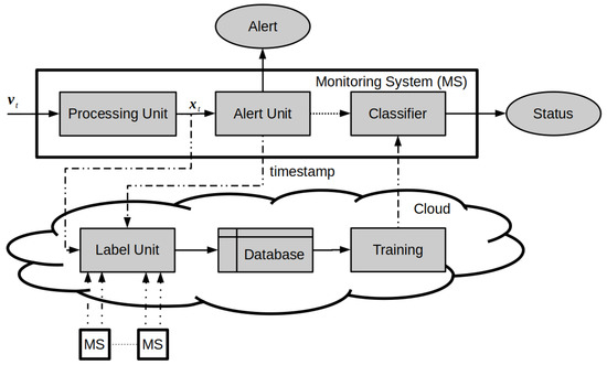 In practice, the remote database stores the data provided by all the monitored systems (MS in Figure 5). The Label Unit characterizes those data along with the timestamps of the alerts, thus building a labeled dataset. In other words, the timestamps, which stem from an unsupervised process, can be used to label the data provided by online measurements. The remote data-warehouse applies machine learning methodologies to that database and computes inferences about the status of the insulation systems under investigation, given a measure (or ) for an apparatus. Within the paradigm of edge computing, the local embedded system just implements the inference function, which receives its parameters from the cloud. The literature provides some examples of hardware-friendly implementations of inference functions [40,41,42] that could be integrated in our low resources system. Such works exploited the paradigm of random basis neural networks to implement an inference function supported by a single hidden-layer feedforward neural network. As a major result, the eventual classifier can achieve a satisfactory trade-off between generalization performance and computational complexity. This in turn enables the deployment of the classifier on resource-constrained devices.