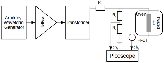 The experimental session involved a set of twisted pair specimens that underwent aging tests according to standard IEC 60851-5. Figure 6 shows the measurement circuit. The sinusoidal power supply, having a frequency of 500 Hz, was provided by an arbitrary waveform generator and then amplified to reach a 3.74 KV peak to peak amplitude. A gained HFCT with a band-pass behavior in the range MHz, placed around the ground cable, served as sensor. The signals were sampled by a Picoscope with a bandwidth in the range MHz and a maximum sample frequency of 1 GSamples/s. The Picoscope collected both the signal from the twisted pair specimens and the signal from a resistive divider as phase reference. All the specimens were placed in an oven at 150 °C.