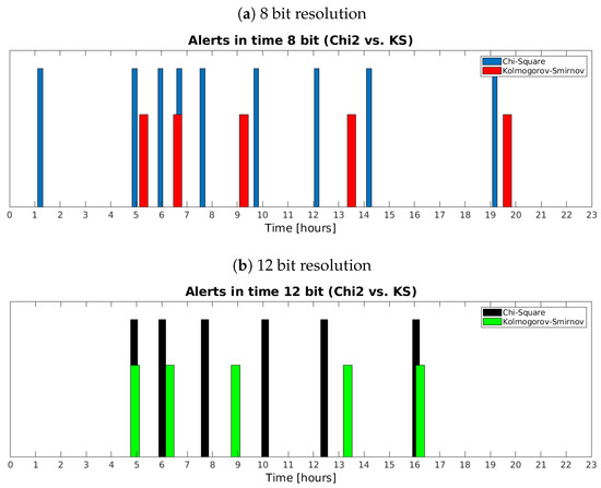 Alerts produced by Chi2 and KS test with resolutions of 8 and 12 bit.