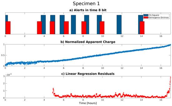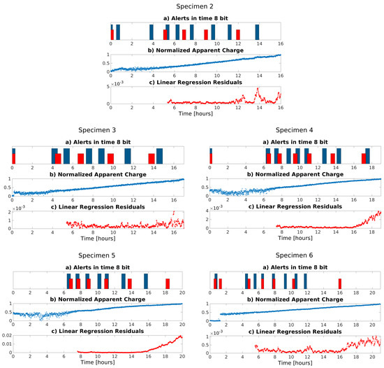 Figure 8 gives the results obtained in the experiments involving specimen #1. The figure compares the outcomes of the proposed monitoring system with those of the state-of-the-art method describe in Section 2. The plot in Figure 8a shows the alert generated by the proposed monitoring system by adopting the same format of Figure 7a. The plot in Figure 8b gives—on the same time scale of Figure 8a—the average apparent charge per cycle computed as per (3); here, the values of have been normalized in the range . The plot in Figure 8c provides—on the same time scale of Figure 8a—the residuals referred to the linear regression computed on the data plotted in Figure 8 as per (4). As specified in Section 2 the linear regression is computed after removing the data belonging to the transient zone. Figure 8b proves that in this experiment the transient ended after about four hours and a half.