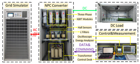 In order to demonstrate the advantages of the proposed controller scheme the NPC power converter laboratory prototype shown in Figure 4 has been used. The most important controller parameters as well passive elements values can be consulted in Table 2. The control objective of the dc-link voltage regulation is set as = 750 V, and the reference value of the reactive power is 0 kVar for the purpose of unity power factor.