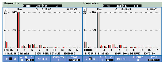 For steady state operation point, the power converter has been operated with a load connected consuming kW of active power. In this sense, both controller schemes have been compared in terms of quality of the grid currents, that are shown in Figure 5. Additionally, to make a fair comparison, the harmonic spectrum of currents measured by Fluke 434-II power analysis meter are also shown in Figure 6. As can be observed, both strategies present a similar performance in terms of the current waveform and total harmonic distortion.