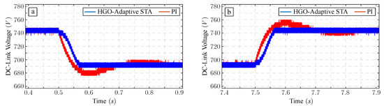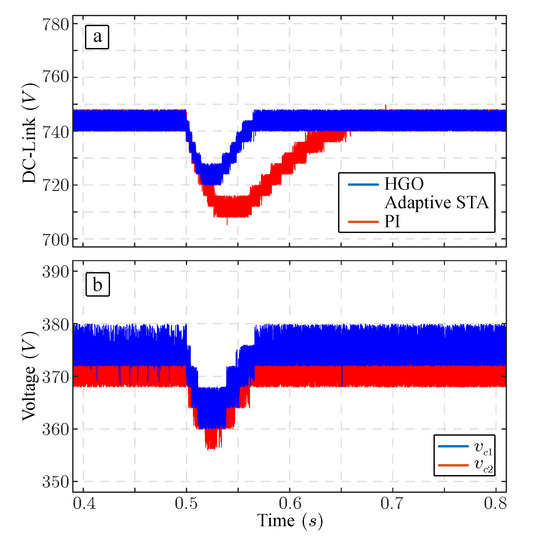 On the one hand, the power converter has been operated under a voltage step. This experiment has been realized considering both strategies. As can be observed in Figure 7a, the experiment starts from a dc-link voltage equalling to 750 V in steady state and a new dc-link voltage reference of 700 V is applied in s. It is easy to deduced that the proposed HGO-Adaptive STA scheme presents a better performance in terms of tracking error as well as settling time. After few seconds of operation, the dc-link voltage reference is set to 750 V anew, and the corresponding transient waveforms are shown in Figure 7b. In this sense, the same conclusions can be extracted.