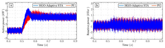 On the other hand, the performance of the proposed control scheme has been evaluated in terms of drop voltage after a dc load variation to test the disturbance rejection ability. For this, a 150 load has been connected during power converter operation as shown in Figure 8a. As can be observed, HGO-Adaptive STA controller improves the performance of traditional PI controller scheme in terms of drop voltage as well as recovery time, which indicates the rather high disturbance rejection ability of the proposed method. Additionally, two dc-link capacitor voltages with the proposed HGO-Adaptive STA method are also given in Figure 8b, which can be observed that the balancing performance is also achieved under a load step. The transient response of active and reactive power under this load steps are also given, which is presented in Figure 9. Clearly, the proposed HGO-Adaptive STA method achieves fast response in power variation simultaneously comparing with the PI controller.