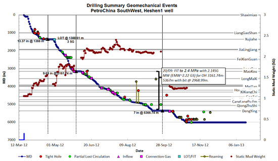 Before constructing a geomechanical model and effectively using it to guide oilfield drilling, completion and development, it is necessary to analyze the wellbore stability characteristics of the wells in the area. A detailed review of each well is an important step in properly developing and verifying a geomechanical model. The analysis of the drilling events that may be related to mechanical instability of the wellbore, hence, can be used to help derive parameters of the geomechanical model and calibrate/verify the model. Examples of such events include tight hole, stuck pipe, pack-off, total losses, partial losses or gains, water influx, excessive reaming and washing, and so forth. Losses or gains of drilling mud help to constrain the minimum horizontal stress, Shmin, and the pore pressure. Stuck pipe or tight hole conditions and hole reaming may indicate excessive amounts of cavings as a result of shear failure (i.e., wellbore breakouts). All those events are plotted against drilling depth and time, together with the mud weights used to facilitate the analysis and verification. The drilling experience review was performed for all of the six wells.