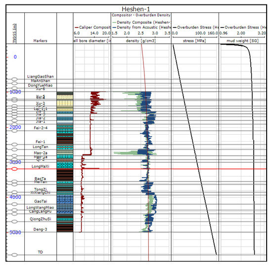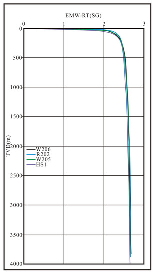 The method of density integral is used to calculate the overlying formation pressure, which requires the rock density data from the surface to the bottom of each well. The density logs of the adjacent wells have not reached the surface. Among them, the density logging of well W206 is about 50 m below the surface, R202 is only below 1988 m, W205 is below 1095 m, H1 is below 1350 m, and the data of W203 and W204 are not collected from 12 ¼ inch well, no overlying formation pressure and other stress parameters. Therefore, exponential fitting was applied to represent the density of the missing interval between the surface and the top of the first reliable density measurement [7,8]. The density curve fit is 2.5 g/cm3 at the ground surface, which is consistent with the density measurements in the similar onshore environments, and also match with the density logs from the wells for the deeper intervals. The trend was used as a proxy of density in the absence of the actual density data in the shallow section. To improve the estimation, the actual density data (from the related wells) and the pseudo-density (where actual density appeared to be affected by hole condition) were combined to estimate the overburden stress.
