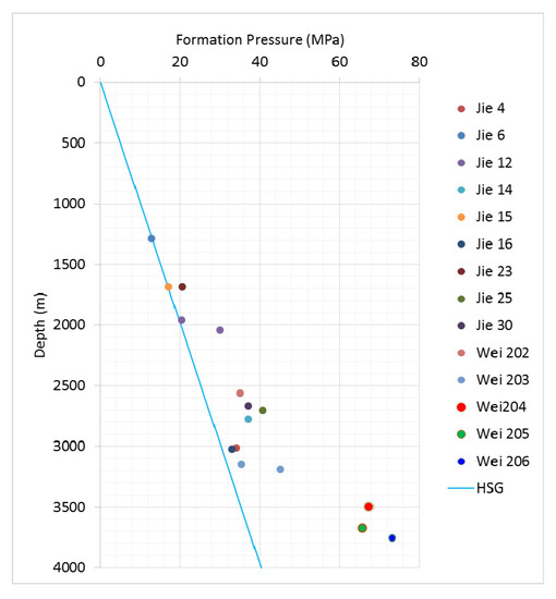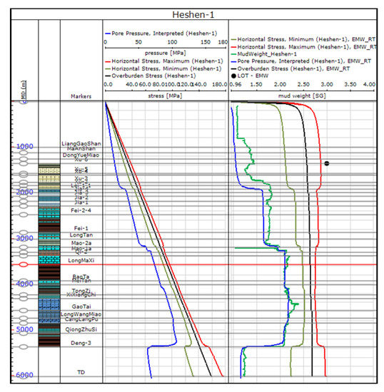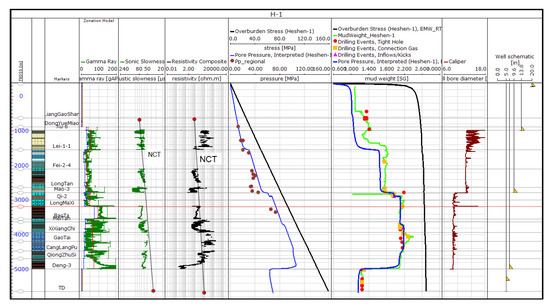 - The pore pressure appears to be approximately hydrostatic from the surface to 1000 m TVD and then becomes overpressured from the Xujiahe Formation. The overpressure generally increases with depth but varies in different formation. The overpressure for H1 from the Jialingjiang to Feixianguan formation appears to be higher than in other offset wells. The Longmaxi formation is generally highly overpressured with a maximum Pp gradient close to 2.1–2.2 SG.
