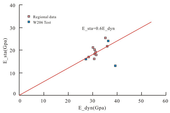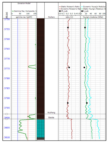 Figure 7 is the crossplot between the static Young’s Modulus derived from laboratory core tests and the dynamic young’s modulus calculated from the wireline acoustic and density logging data. Because there is only three tests available in W206, the regional data was referenced to help derive a relationship between static and dynamic Young’s Modulus. Therefore, the relationship between the static and dynamic Young’s Modulus is [15,16,17]: