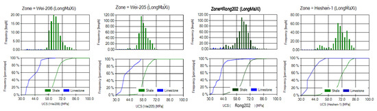 Figure 9 displays the rock strength comparison in the Longmaxi Formation for W206, W205, H1 and R202. The upper images are the frequency of different UCS, and the lower curve is the UCS cumulative curve. P10 (10%) represents the corresponding UCS when the cumulative UCS frequency reaches 10%.