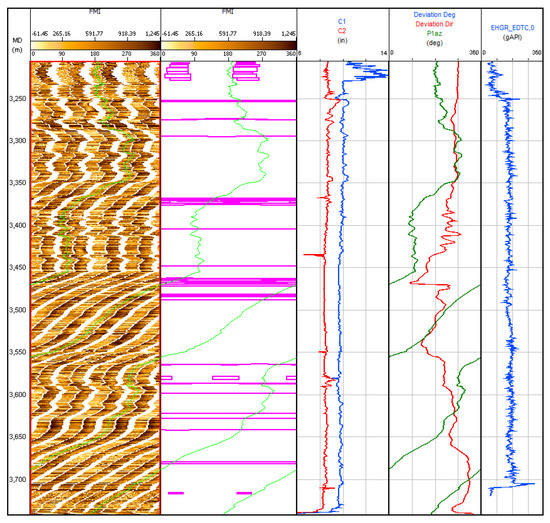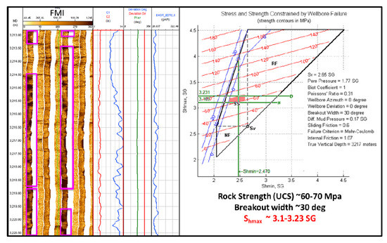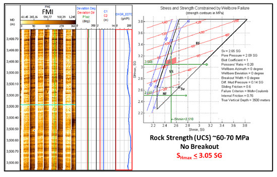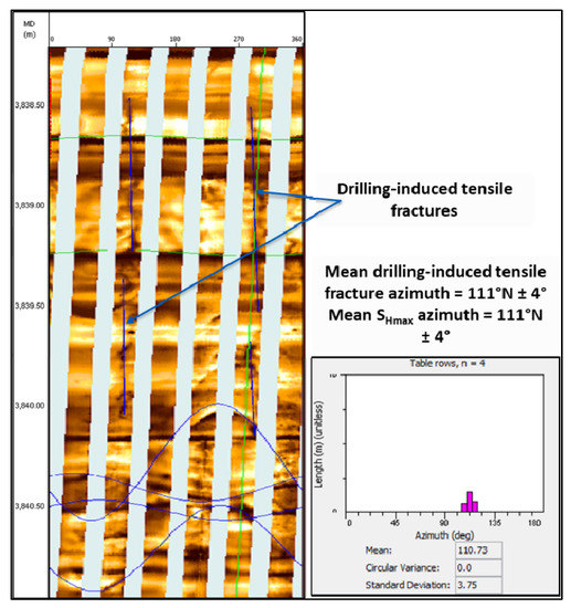The orientation of SHmax was constrained using observations of borehole failure in the study wells. Wellbore failure analysis allows us to constrain the orientation and magnitude of the maximum horizontal stress (SHmax) because stress-induced wellbore failures occur due to the stress concentration acting around the wellbore during drilling. The presence, orientation, and severity of failure are a function of the in-situ stress field, wellbore orientation, and rock strength [18,19,20]. Wellbore breakouts appear in electrical image data as low or high conductivity (depending on the drilling fluid used) on opposite sides of the wellbore wall. Usually these appear as out of focus zones in electrical image log data due to the pad being out of contact with the wellbore wall. Drilling-induced tensile fractures appear as thin dark bands approximately parallel to the axis of a vertical wellbore occurring 180 degrees apart in the image.