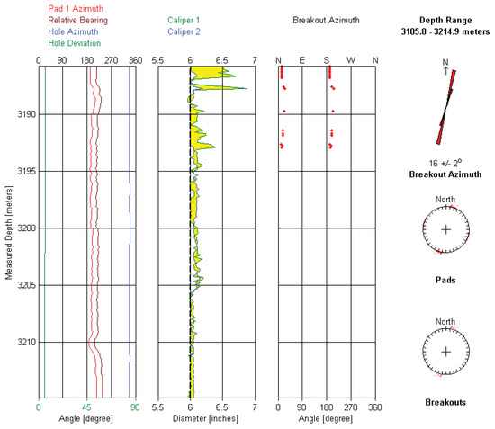 In fact, the position of these features around the wellbore can be used to determine the azimuth of SHmax. The azimuth of wellbore breakout indicates the azimuth of SHmin, and the azimuth of drilling-induced tensile fractures indicates the direction of SHmax [19,21,22,23]. The full wellbore micro-resistivity imaging (FMI) and Caliper log data of W203 and W205, and the XRMI data of R202 were obtained to analyse the SHmax direction. Figure 10 shows wellbore breakout examples from W205. The mean wellbore breakout width is 57 ± 9° and the azimuth of SHmin is 36° N. Therefore, the azimuth of SHmax is 126° N.