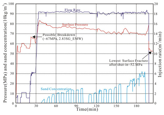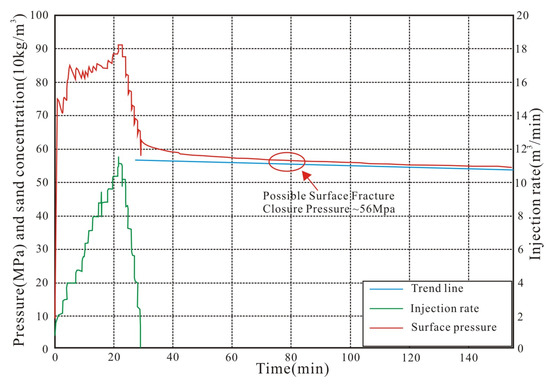 The ESR approach was used to extrapolate the SHmin profile for the entire depth coverage based on the LOT data from NDNR block. Because there is no digital data available, the SHmin profile was calibrated using mini-frac interpretations of W205 and hydraulic fracture interpretations of W206. Mini-frac tests remain the most reliable method for determining the minimum (usually horizontal) in situ total stress. It was a shut-in test in the paper, the fracture closure pressure (FCP) can be determined by plotting pressurer as a function of time and detecting a change in linearity of the pressure decay [26,27]. Fracture closure pressures from mini-frac and hydraulic fracturing data were used to calibrate the estimation of SHmin in W205 and W206 (Figure 13, Figure 14, Figure 15 and Figure 16). An average effective stress ratio of 0.7 was used to constrain the SHmin profile from the surface to TD. The same approaches were applied to the SHmin modelling for the other wells.