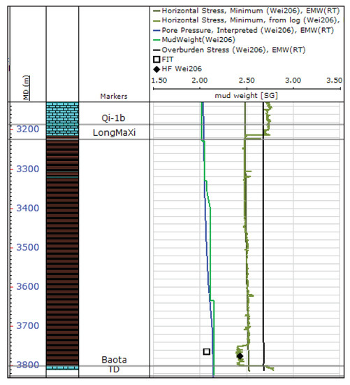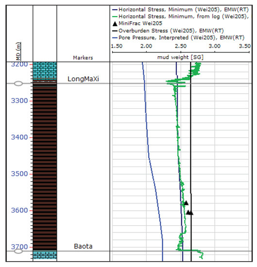There are several ways of calculating the magnitude of the minimum horizontal stress (SHmin) including log-based methods and direct measurements such as leak-off tests, extended leak-off tests, mini-frac, micro-frac, hydraulic fracturing, and so on [24]. The most reliable measurement of in situ minimum horizontal stress (SHmin) is the diagnostic mini-frac or extended leak-off test, XLOT [25]. Good XLOT or mini-frac data are not always available. The equivalent circulation density (ECD) of the drilling fluid at the time of losses can provide an estimate of SHmin.