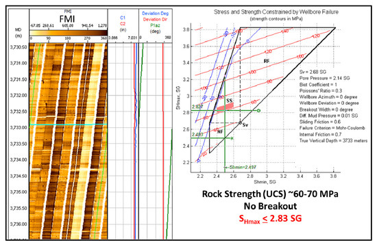 The log-derived Shmin and SHmax magnitudes estimated by the “constant strain” method are determined as [18,19,20]:
