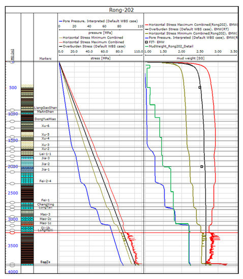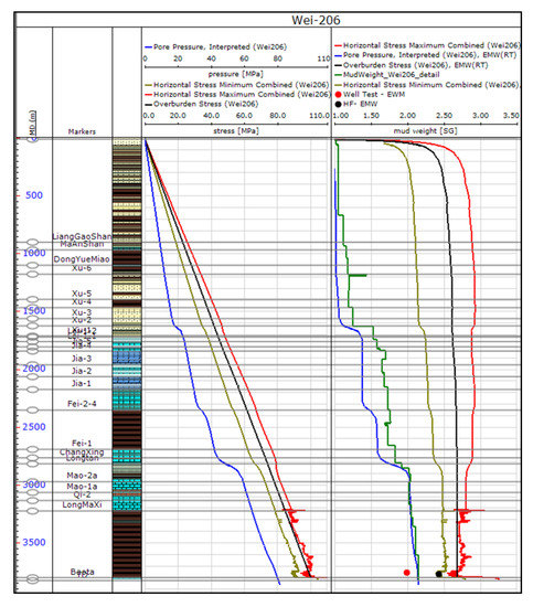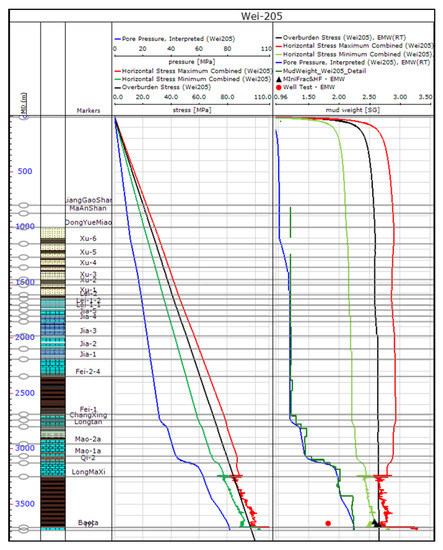 In order to achieve efficient development of shale gas resource in the area, it is necessary to analyze the stress state, pore pressure and reservoir mechanical properties to establish a precise geomechanical model, therefore avoiding complex drilling such as collapse, kick, mud losses, and so on. A geomechanical model is made up of five principal components, which are the three principal stresses, pore pressure, and rock mechanical properties. The three principal stresses are the vertical stress, Sv; the maximum horizontal stress, SHmax; and the minimum horizontal stress, SHmin. The rock mechanical properties comprise several physical rock properties such as unconfined compressive strength (UCS or C0), internal friction coefficient (IF), Young’s modulus (E), Poisson’s ratio (ν), and the Biot coefficient(α). The magnitudes and orientations of the principal stresses make up the in-situ stress tensor [4,5]. They interact with the other two geomechanical components, the pore pressure and the rock strength, to induce geomechanical issues during drilling, for example, wellbore breakouts, drilling fluid losses and sand production.
