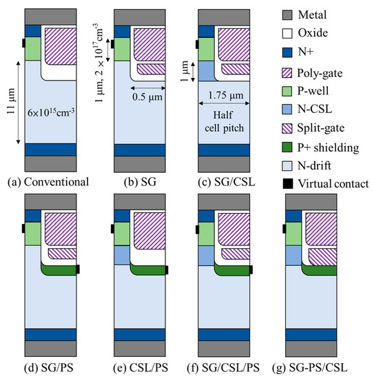 Schematics of different gate structures studied in this paper. A novel proposed UMOSFET with SG in contact with PS structure is shown in (g). All devices have a cell pitch of 3.5 μm. (a). Conventional; (b). SG; (c). SG/CSL; (d). SG/PS; (e). CSL/PS; (f). SG/CSL/PS; (g). SG-PS/CSL.